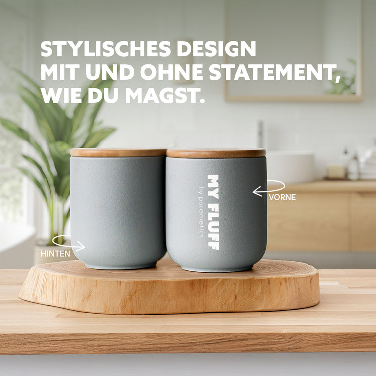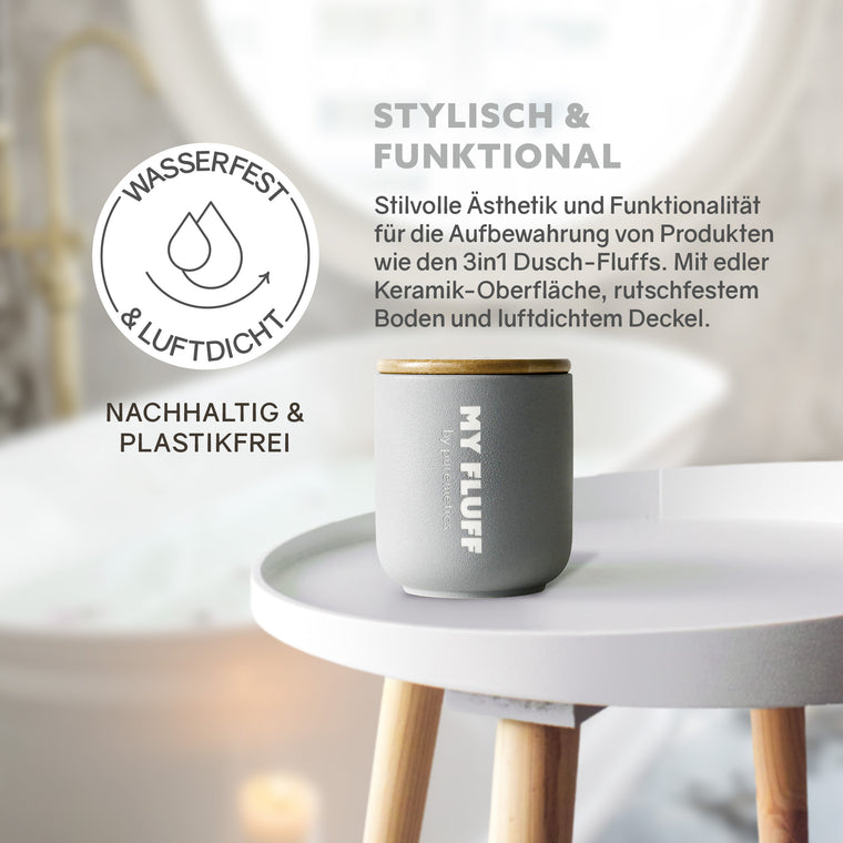 Mit dem MY FLUFF Keramikgefäß bewahrst du deinen Dusch-Fluff nicht nur praktisch, sondern auch besonders stilvoll auf. Einfach den Fluff mit einem Esslöffel aus dem Pappbecher in das Gefäß umfüllen, Deckel schließen – fertig. So bleibt dein Produkt lange frisch und optimal vor Feuchtigkeit geschützt.